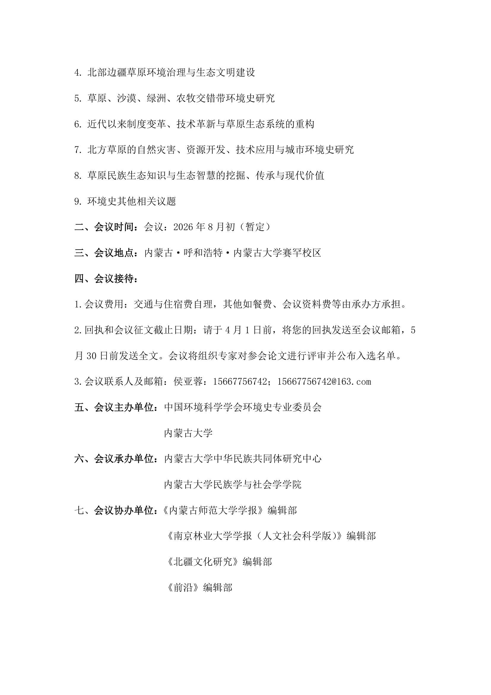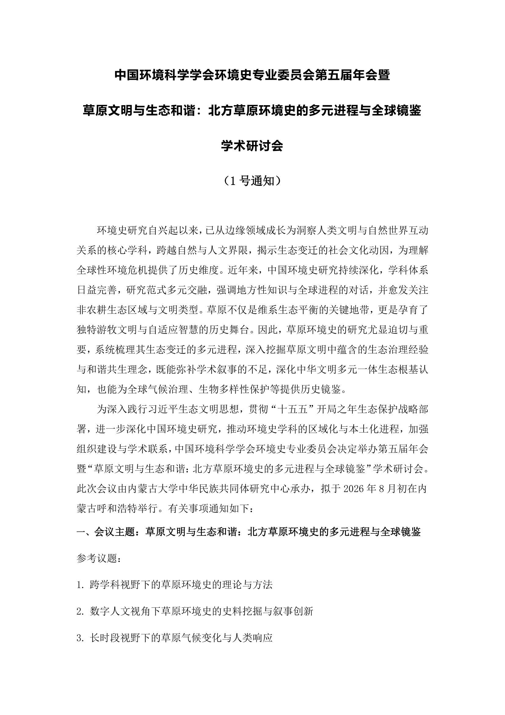 中国环境科学学会环境史专业委员会第五届年会暨 草原文明与生态和谐:北方草原环境史的多元进程与全球镜鉴学术研讨会